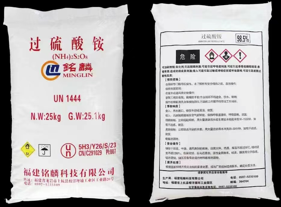 过硫酸铵(Ammonium persulphate),别称过二硫酸铵,是一种铵盐。分子式为H8N2O8S2.是无色单斜结晶或白色结晶粉末。熔点120摄氏度,相对密度为1.982。有强氧化性和腐蚀性。完全干燥的过硫酸铵不易分解,潮湿的会分解放出氧气和臭氧。易溶于水,水溶液在室温下也会分解。与金属接触也会分解。